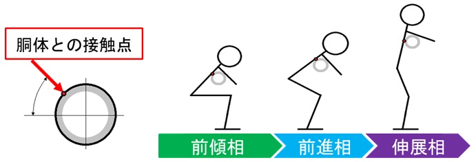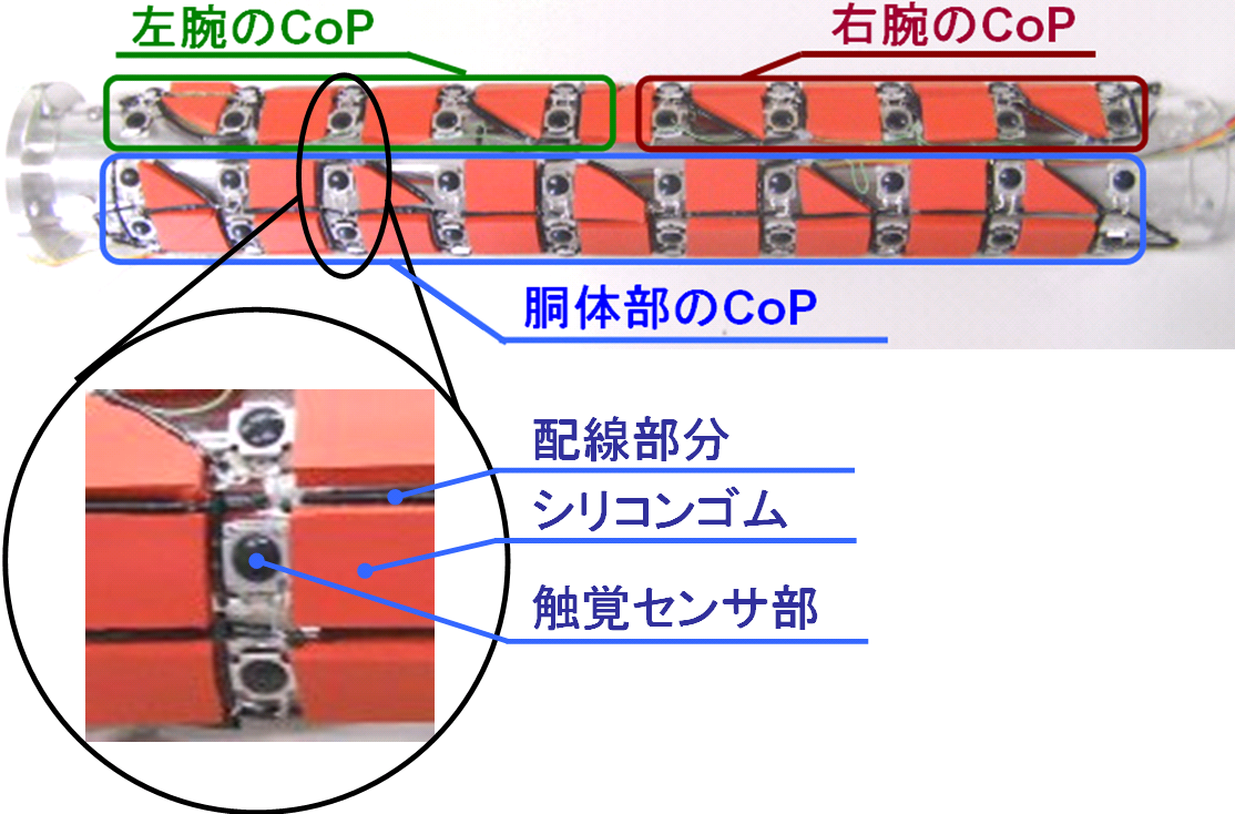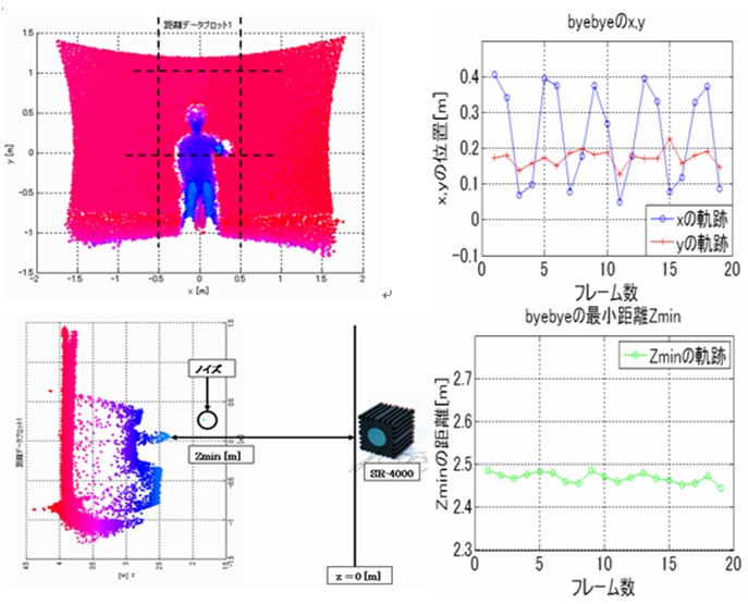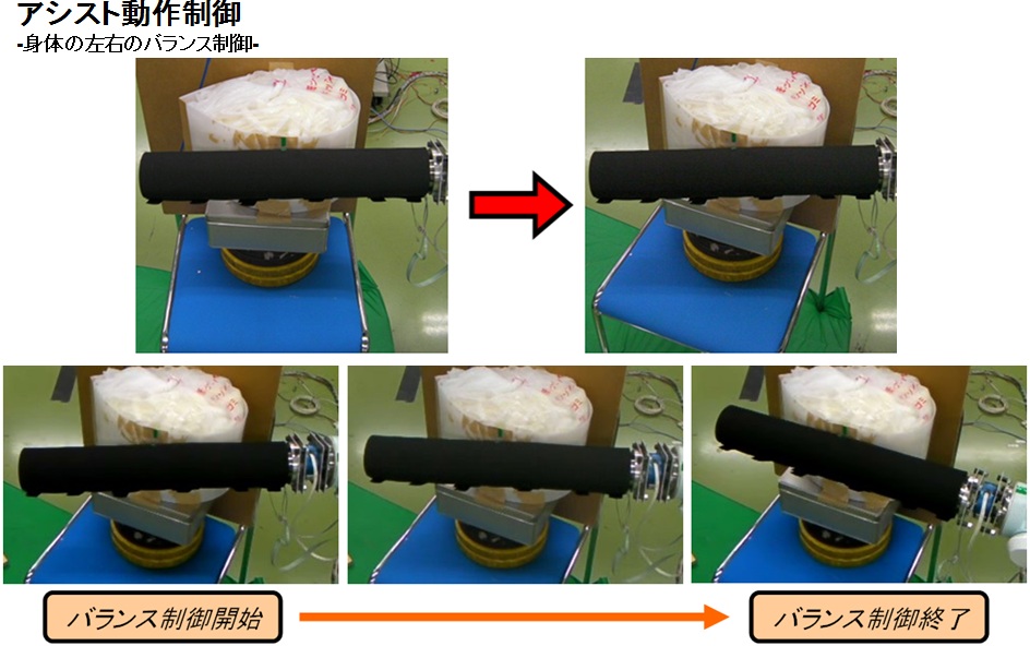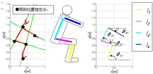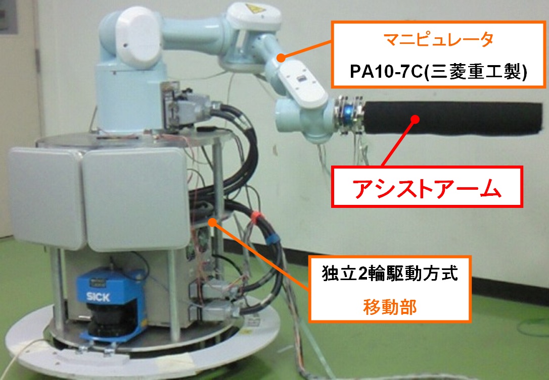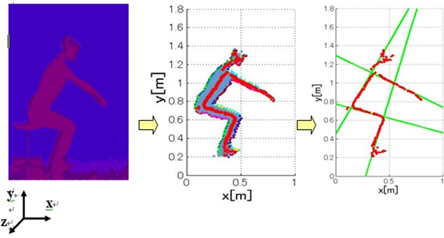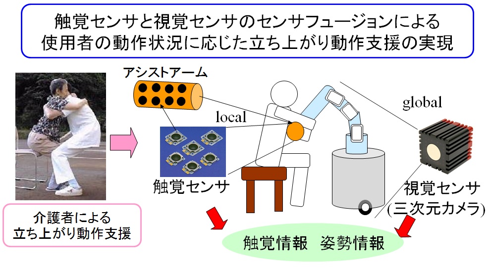 移動マニピュレータによるヒューマンアシストに関する研究非健常者の立ち上がり動作アシスト近年,少子高齢化社会による労働力不足が懸念される中,家庭内労働ロボット,いわゆるホームサービスロボットの必要性が認識され始めています.本研究室では,移動マニピュレータによるホームサービスの一環として,移動マニピュレータのアームを覆う離散型高速触覚(CoP) センサと,3 次元距離測定カメラを用いて,リアルタイムフィードバック制御により,非健常者の動作アシストを安心・安全かつ適切に実現することを目指しています. 移動マニピュレータ本研究室で用いる移動マニピュレータとは図 2に示す独立2輪駆動方式で操舵する移動部をベースにしており,その上にマニピュレータとして三菱重工製汎用ロボットアームPA10-7C を搭載したものです. アシストアーム立ち上がり動作のアシストを行う際に,人が脇下に入れて掴まるアームの部分(以下, アシストアームと呼ぶ) には触覚センサを搭載しています.本研究では触覚センサとして離散型CoPセンサを採用しました.立ち上がり動作のアシスト中はアシストアームに被介助者が直接触れているため,立ち上がりアシスト中の被介助者がアームにしっかり掴まっているか,立ち上がり動作が行えているか,そして立ち上がり動作のどの段階にきているかといった情報を得ることが出来ます.そこで,アシストアームのCoPセンサ配置は左腕,右腕,胴体部の3箇所として,各部分のCoPセンサの出力(荷重中心位置と総荷重)を計測しています. 離散型CoPセンサ離散型CoPセンサはあらゆる自由曲面上にネットを被せるように触覚センサを配置することが可能であり, 配線はセンサ素子数によらず4本で済みます.またソフトウェアによる処理を必要としない高速な応答速度(1[ms] 以下) を持っています.そしてセンサの2次元表面に加わる荷重分布の中心位置とその総荷重を検出することができ, 安価であるという特長を持っています. 身体の左右のバランス制御人がアシストアームに掴まっているときに長手方向の荷重中心位置が変化した場合,それは人とアームの間で転がり運動が起こったと考えられます.このまま支援を行うと転倒の恐れがあるので,長手方向の荷重中心位置がアシストアームの中心に来るように,アームを制御して転がり運動を行わせる必要があります.この実験の際,安全上のため,人の代わりに人体の体幹を模した楕円形物体を作成して行いました.結果は図の通り,はじめ体の中心から外れていたアームは制御終了時には中心に戻っていることを確認しました. 立ち上がり支援軌道の生成人がアシストアームに掴まっているときに円周方向の荷重中心位置の出力を読み取ることで図のような立ち上がり状況の推定を行っています.人がアシストアームに掴まって立ち上がる際の円周方向の荷重中心位置を計測した実験から図のような変化があることがわかりました.前傾層から前進相にかけては円周方向の荷重中心位置が上方へ遷移し,前進相から伸展相にかけては円周方向の荷重中心位置が下方へ遷移していきます.この情報から姿勢や状態を推定し,支援軌道をファジィ制御によって修正しながら支援を行っています.動画では,安全上のため人の代わりに人体を模した人形を用いて,立ち上がりのアシストを行っています. 3次元距離測定カメラ本研究室で用いる3次元距離測定カメラとは図に示す赤外線TOF方式3次元距離測定カメラ「SwissRanger SR-4000」です. SR-4000 は,TOF 原理に基づいて動作するカメラです.このTOF とは「Time-of-Flight method(飛行時間計測方式)」の略であり,前面のLED より強度変調して発光された赤外線が対象物体で反射して戻ってくるまでの時間を計測することで,物体までの距離を取得するというものです. 人間動作の認識本研究室ではSR-4000を使った研究として,人間動作の認識を行っています. その中の一つであるジェスチャ認識は図8に示すように,手の動きを特徴としてx,y,z方向に描いた軌跡からジェスチャを判別しています.例として図にはbyebyeジェスチャの軌跡を示しています. ジェスチャ認識とは別に人間の立ち上がり動作中の姿勢認識を行なっています.姿勢認識方法として,まず取得した距離画像データ(図9左)からエッジパターン抽出により特徴点(図9中央)を抽出し,そしてLMedSハフ変換を用いて人体の骨格線(図9右)を抽出しています.これらの骨格線から関節位置(図10左)を推定し,さらにそこから関節角度および部位長さの推定(図10右)も行っています. これからの研究の展開触覚センサ,視覚センサのセンサフュージョンにより非健常者の動作アシストを安心・安全かつ適切に行えるよう研究を進めていきます. また,視覚センサとしてマイクロソフトより発売されたKinectの使用も検討しています. Kinectは左図に示すデバイスで3次元画像とRGB画像を同時に取得することができ,安価であるという特徴を持っています.また,人間動作の認識が容易に行えるライブラリが提供されており,右図のように人間の姿勢認識